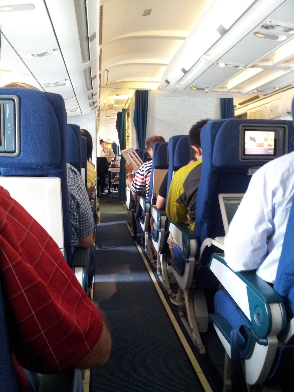 准时乘上飞机!飞机师这时报告说,飞机有些问题他们的技术人员需要一个小时的时间来解决,感谢我们的耐心等候。我们就只好坐着慢慢地等,等了一个多小时,又再报告需要更长的时间。真是考验我们的耐心啊!不过,这班机的人都好有耐心(看照片大家都在看报纸,用电脑),空姐也时时递水给我们喝。